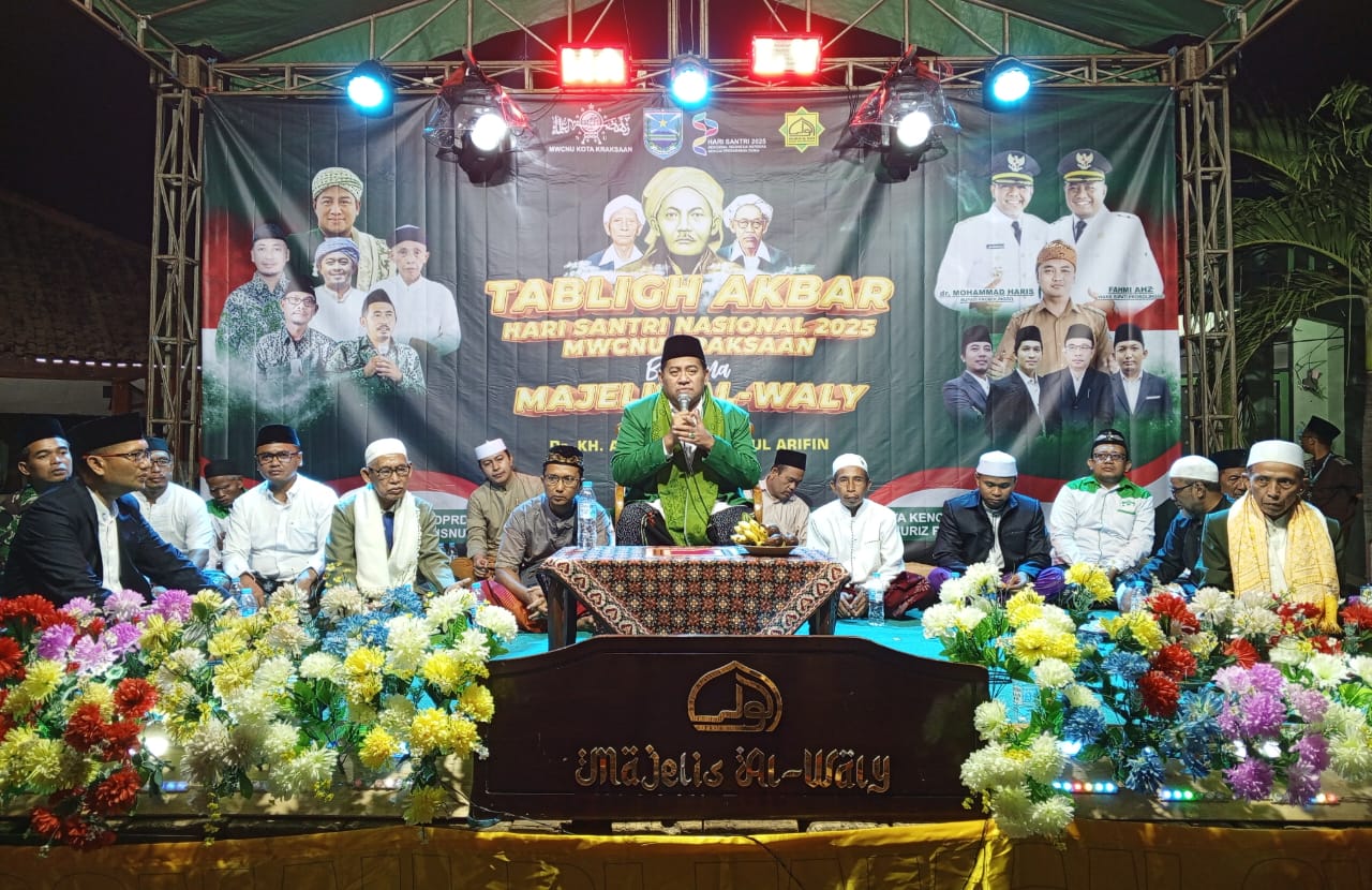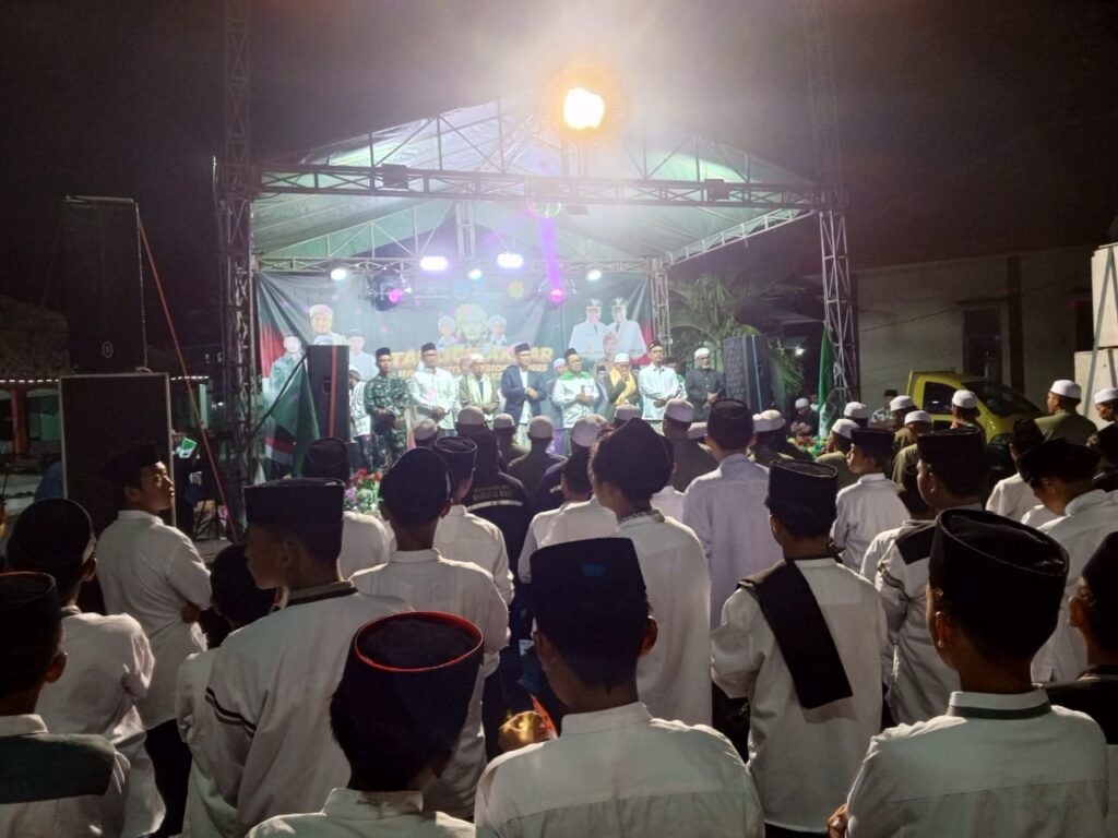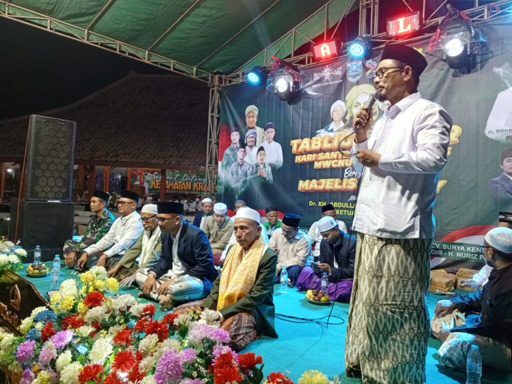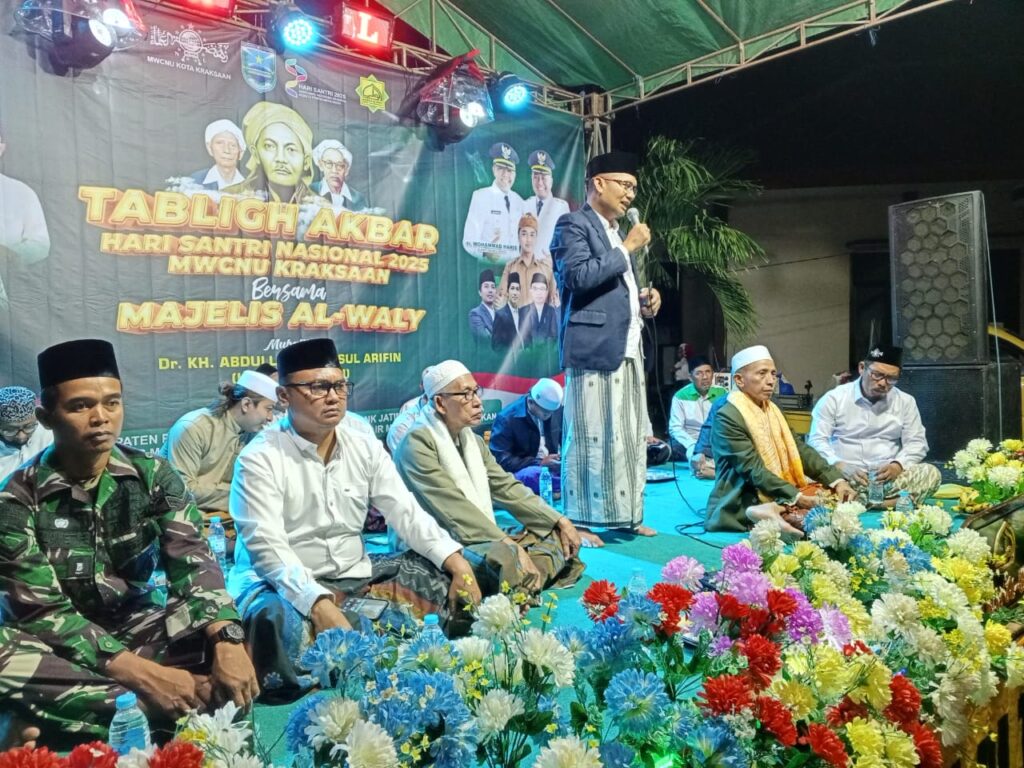 Kraksaan, mwcnukraksaan.or.id — Ribuan santri dan warga Nahdliyin tumpah ruah di halaman Kantor Kecamatan Kraksaan, Ahad malam (2/11/2025), dalam rangka malam puncak peringatan Hari Santri Nasional (HSN) 2025 yang digelar oleh Majelis Wakil Cabang Nahdlatul Ulama (MWCNU) Kraksaan. Acara ini menghadirkan Majelis Al-Waly dan KH Abdullah Syamsul Arifin, Ketua Lembaga Dakwah Pengurus Besar Nahdlatul Ulama (LD-PBNU), sebagai mubaligh utama. Kegiatan yang dimulai pukul 19.00 WIB tersebut diawali dengan pembacaan tahlil oleh pengurus MWCNU Kraksaan dan diikuti oleh ribuan jamaah. Suasana semakin semarak dengan tabuhan rebana dan lantunan sholawat dari Majelis Al-Waly yang menggema di seluruh area acara. Bupati Probolinggo Gus dr. Moh. Haris yang dijadwalkan hadir berhalangan, dan diwakili oleh Asisten Pemerintahan dan Kesra, Abdul Ghofur, S.STP., M.Si. Dalam sambutannya, Abdul Ghofur menyampaikan apresiasi atas semangat ke-NU-an yang tampak dalam kegiatan tersebut. “Atas nama Pemerintah Kabupaten Probolinggo, kami menyampaikan apresiasi setinggi-tingginya kepada MWCNU Kraksaan yang telah menyelenggarakan kegiatan ini. Tabligh Akbar seperti ini bukan hanya menjadi sarana silaturahim, tetapi juga memperkuat nilai-nilai keagamaan dan kebangsaan di tengah masyarakat,” ujar Abdul Ghofur. Turut hadir dalam kesempatan tersebut Rois Syuriah PCNU Kota Kraksaan KH Abdul Wasik Hanan, Camat Kraksaan Puja Kurniawan, Danramil, Kapolsek Kraksaan, Rois Syuriah MWCNU Kraksaan KH Ahmad Haidori, serta Ketua MWCNU Kraksaan Drs. H Mohammad Sahudi, M.Pd. dan para pengasuh pondok pesantren di wilayah kecamatan Kraksaan. Dalam sambutannya, Drs. H Mohammad Sahudi, M.Pd. menyampaikan bahwa peringatan HSN tahun ini menjadi momentum kebersamaan warga NU di Kraksaan. “Rangkaian kegiatan HSN 2025 ini kita mulai dengan ziarah ke makam Muassis NU Kraksaan, dilanjutkan dengan jalan sehat bersarung, dan malam ini ditutup dengan tabligh akbar bersama KH Abdullah Syamsul Arifin. Semoga semangat santri selalu hidup di tengah masyarakat kita,” ungkapnya. Sementara itu, dalam tausiyahnya, KH Abdullah Syamsul Arifin (Gus Aab) menegaskan bahwa peringatan Hari Santri tahun 2025 merupakan peringatan ke-9 sejak ditetapkannya oleh pemerintah pada tahun 2016 silam. Ia menilai bahwa momentum ini harus dimaknai sebagai pengingat atas jasa besar para ulama dan santri dalam perjuangan bangsa. “Hari Santri bukan sekadar perayaan seremonial. Ini adalah bentuk pengakuan negara atas peran ulama dan santri dalam memperjuangkan kemerdekaan serta menjaga keutuhan bangsa. Kini tugas santri adalah melanjutkan perjuangan itu dengan ilmu, akhlak, dan pengabdian,” tegas Gus Aab. Ia juga menekankan pentingnya peran pesantren dan kiai dalam membentuk karakter generasi muda. “Santri hari ini harus menjadi benteng moral bangsa. Di bawah bimbingan para kiai, pesantren harus terus melahirkan generasi yang berilmu, berakhlak, dan mencintai tanah air,” ujarnya disambut lantunan sholawat dan takbir dari ribuan jamaah. Acara malam puncak HSN 2025 MWCNU Kraksaan berlangsung dengan khidmat dan penuh semangat. Di penghujung acara, seluruh jamaah bersama para kiai memanjatkan doa untuk keselamatan bangsa dan kejayaan Islam di Indonesia. Penulis: Alfin Maulana Haz Post navigation Sukses! 10.000 Santri Ramaikan HSN MWCNU Kraksaan PCNU Kraksaan Masa Khidmat 2025–2030 Resmi Dilantik