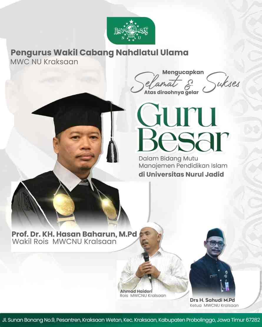 Kraksaan, mwcnukraksaan.or.id — Kabar membanggakan datang dari lingkungan Nahdlatul Ulama Kraksaan. Wakil Rais Majelis Wakil Cabang Nahdlatul Ulama (MWCNU) Kraksaan, Prof. Dr. KH. Hasan Baharun, M.Pd, resmi meraih gelar Guru Besar (Profesor) dalam bidang Mutu Manajemen Pendidikan Islam di Universitas Nurul Jadid, Paiton, Probolinggo. Pencapaian akademik tertinggi ini menjadi tonggak penting dalam perjalanan keilmuan KH. Hasan Baharun, yang selama ini dikenal luas sebagai sosok pendidik, akademisi, dan ulama yang konsisten mengabdikan diri pada pengembangan kualitas pendidikan Islam, baik di lingkungan pesantren, perguruan tinggi, maupun organisasi keagamaan. Keluarga Besar MWCNU Kraksaan menyambut capaian tersebut dengan rasa syukur dan kebanggaan. Gelar Guru Besar yang diraih tidak hanya menjadi prestasi personal, tetapi juga menjadi kebanggaan kolektif bagi Nahdlatul Ulama, khususnya di tingkat MWCNU Kraksaan. Hal ini menegaskan bahwa tradisi keilmuan NU terus hidup dan berkembang melalui kader-kader terbaiknya. Dalam bidang Mutu Manajemen Pendidikan Islam, Prof. KH. Hasan Baharun dikenal aktif melakukan kajian, penelitian, dan pengembangan konsep manajemen pendidikan yang berorientasi pada peningkatan kualitas lembaga pendidikan Islam secara berkelanjutan, tanpa meninggalkan nilai-nilai Ahlussunnah wal Jamaah yang menjadi ruh pendidikan NU. Sebagai Wakil Rais MWCNU Kraksaan, Prof. KH. Hasan Baharun selama ini juga berperan aktif dalam memberikan arahan keagamaan, penguatan keilmuan, serta pendampingan kepada warga NU, khususnya dalam isu-isu pendidikan dan pengembangan sumber daya manusia. MWCNU Kraksaan berharap, capaian ini semakin memperkuat kontribusi Prof. KH. Hasan Baharun dalam membangun pendidikan Islam yang bermutu, adaptif terhadap perkembangan zaman, serta tetap berakar kuat pada tradisi pesantren dan nilai-nilai ke-NU-an. “Semoga amanah keilmuan ini membawa keberkahan, memperluas kemanfaatan, dan menjadi amal jariyah yang terus mengalir,” demikian harapan Keluarga Besar MWCNU Kraksaan. Dengan diraihnya gelar Guru Besar ini, MWCNU Kraksaan optimistis bahwa peran ulama-akademisi seperti Prof. Dr. KH. Hasan Baharun, M.Pd akan semakin strategis dalam menjawab tantangan pendidikan Islam di masa kini dan masa depan. Kontributor: Alfin Maulana Haz Post navigation PCNU Kraksaan Masa Khidmat 2025–2030 Resmi Dilantik Peduli Bencana Tiris, LAZISNU MWCNU Kraksaan Ajak Masyarakat Berdonasi
